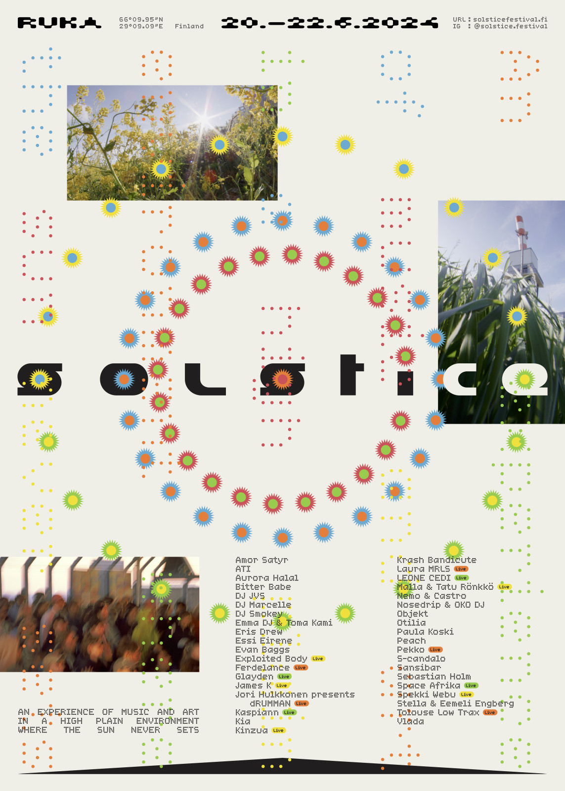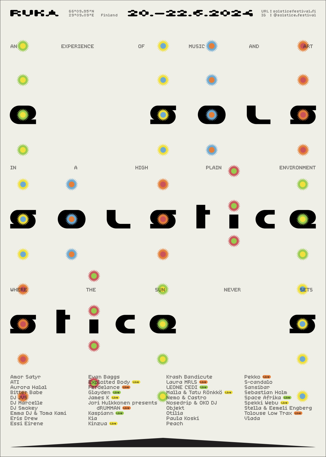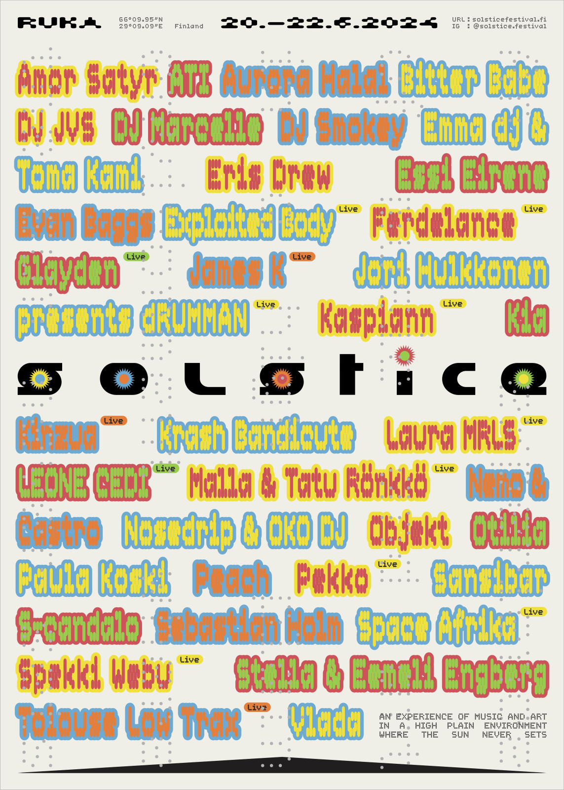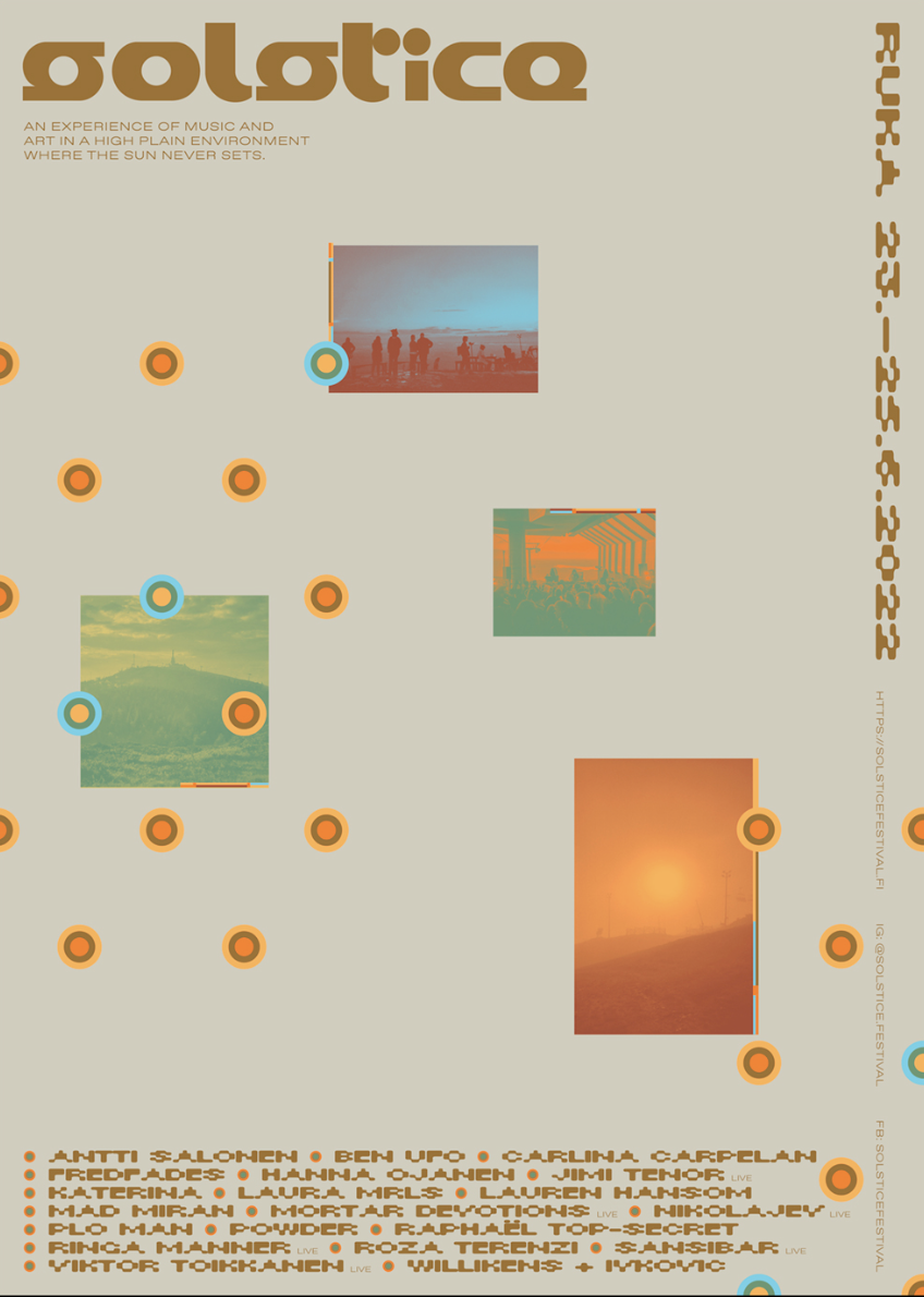 Solstice Festival is a gathering for people who enjoy music, art and nature, preferably combined. It takes place during midsummer in northern Finland next to the Arctic Circle. The festival site, Rukatunturi, is an arctic fell which rises half a kilometer above sea level, giving people picturesque views over pine trees and lakes. That time of the year combined with the northern location means the sun doesn’t set at all, creating a unique atmosphere — a celebration of light and life.